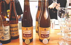 アッヘル・ブルインは、やさしい感じで、香りはブロンドと共通。全体に何に似ているかというと、ロシュフォールの6なのである。それというのもアッヘルのビールは、トーマス神父が病気で引退後、ロシュフォールからアントワーヌ神父が招かれて、醸造しているのである。ロシュフォールのビールはすべてブラウン色のビール。アッヘルにブラウンが登場しても不思議ではない。それにロシュフォール6といっても、実際にはアルコール度数が7.5%もあり、アッヘル8Bruinの8%に近いのである。 |