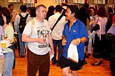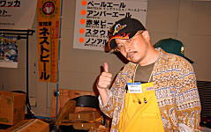 | 本来、地ビールのフェスティバルだったが、地ビール愛好家の多様な嗜好に合わせてか、年々、地ビールの枠にとらわれず、海外のビールの出展や試飲コーナーが増えてきている。 我々も地ビールが一同に会し、比較試飲できる数少ないイベントとして参加したが、このページでは、特にベルギービールファンとしての立場から、興味を惹いたものを紹介する。 さて、我々が参加した土曜日は、台風で大雨、風。その影響でグラスやビールの到着が遅れたりで、トラブル発生。グラスが届いた午後4時すぎまでは、プラスチックのカップでの試飲。 |